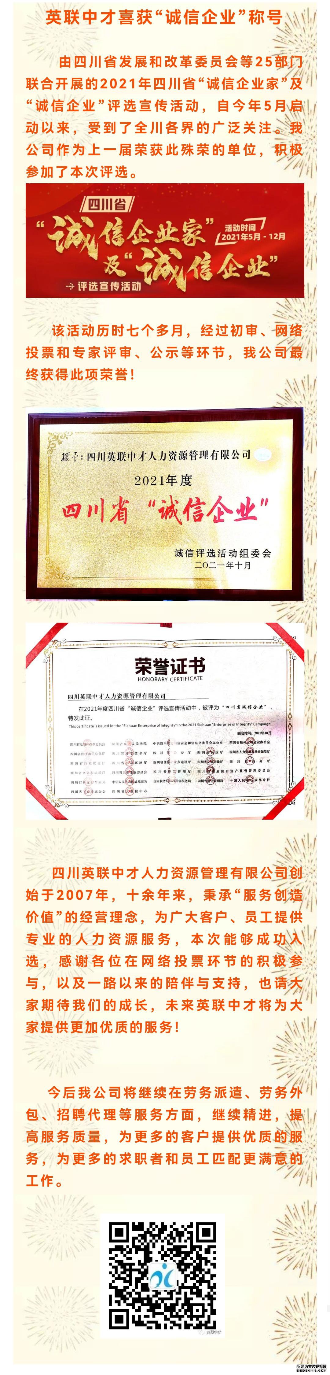 英联中才喜获四川省“诚信企业”荣誉